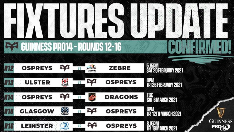 Ospreys will welcome Zebre to Ospreylia on Saturday 20th February K.O 5:15pm, before travelling to Belfast to take on Ulster four round 13 on Friday 26th February, K.O 8pm.